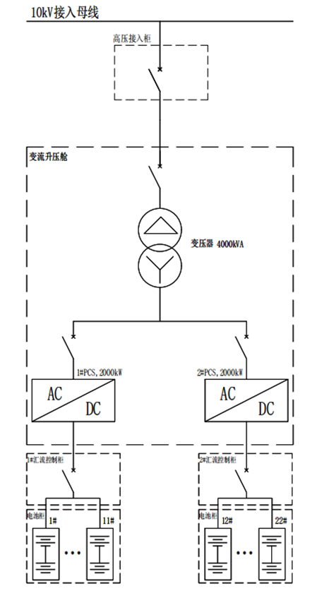 系統設計采用22臺LSHe-CP372L液冷柜和1臺4MW升壓變流一體艙組成4MW/8.2MWh儲能系統。每11臺LSHe-CP372L接入一個控制柜組成一個儲能矩陣,每個儲能矩陣接入2MW升壓變流一體艙的一個支路,再經升壓系統升壓后經過并網柜接入10kV高壓母線,實現用戶需求功能。