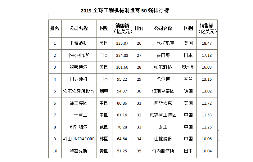 會議期間,組委會發布了在業內極具公信力和影響力的“2019全球工程機械制造商50強、100強”、“2019中國工程機械產業影響力100人”、“2019全球起重機制造商10強”、“2019全球、中國塔式起重機制造商10強”、“2019全球、中國高空作業設備制造商10強”、“2019全球礦山設備制造商10強”、“2019中國工程機械代理商10強”等多個榜單。卡特彼勒作為全球工程機械的領頭羊繼續榮登榜首。