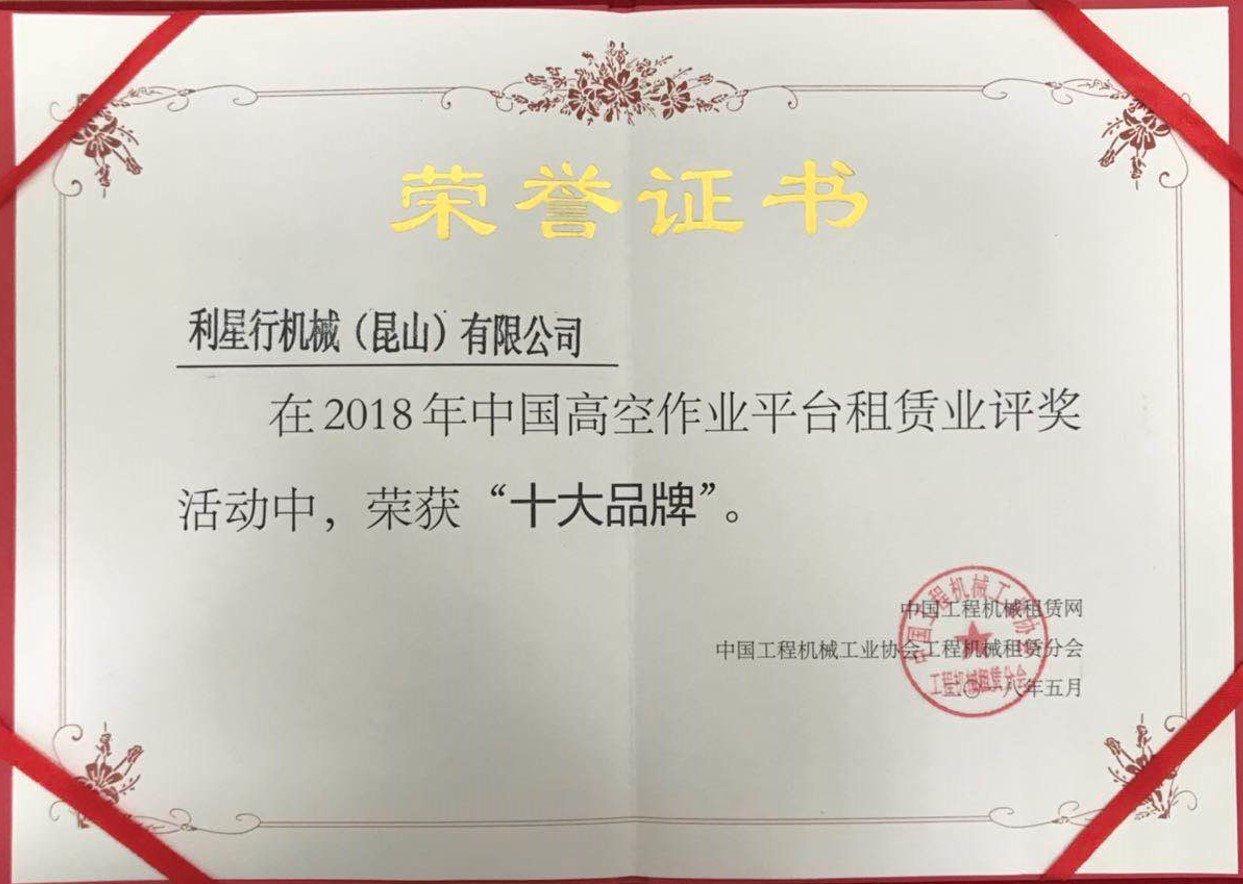 JIUYOU.COM九游(中國機械(昆山)有限公司榮獲由“中國工程機械租賃網”和“中國工程機械工業協會工程機械租賃分會”聯合授予的2018中國高空作業平臺租賃業“十大品牌”榮譽稱號。