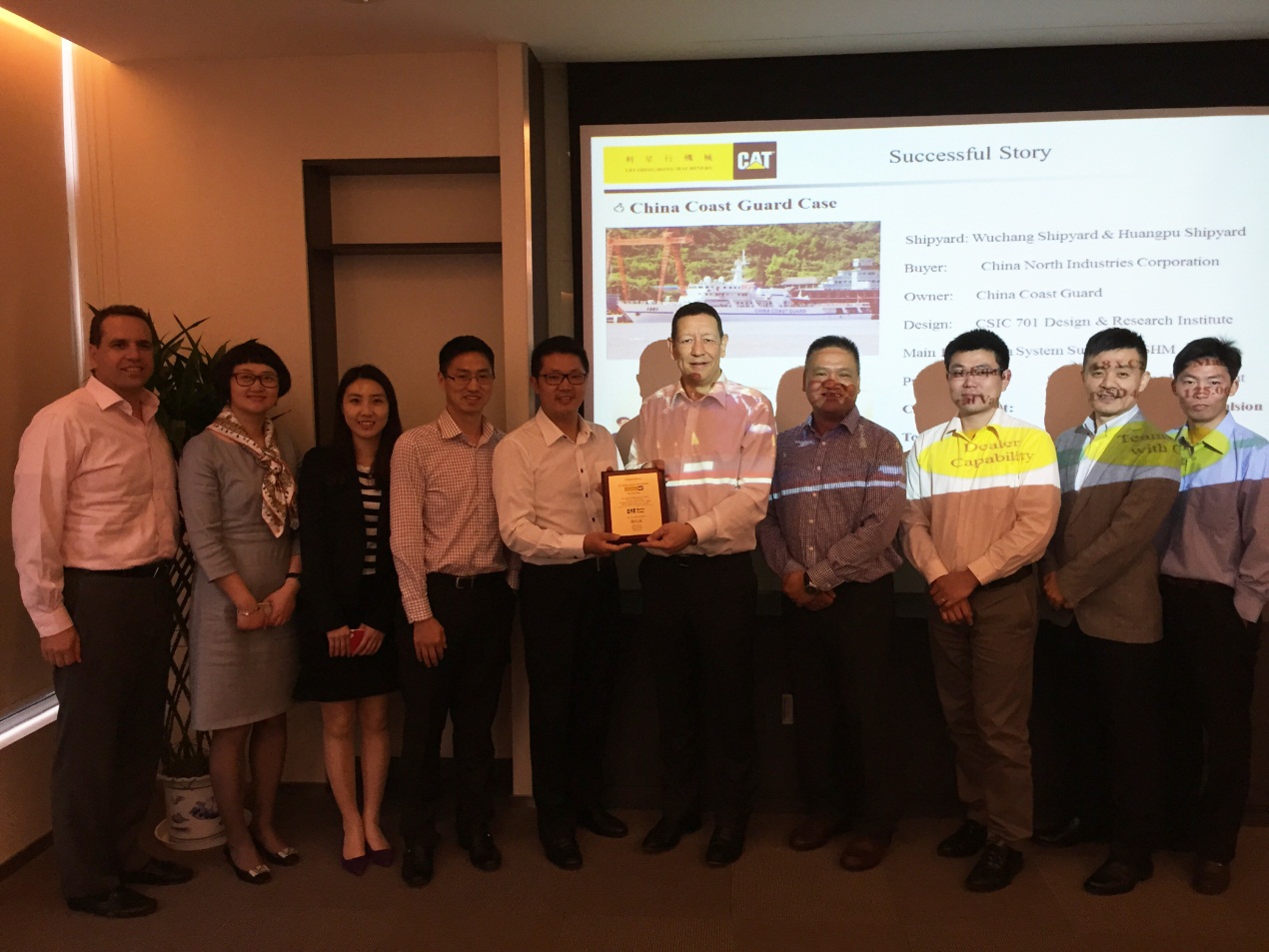 2015年5月26日,卡特彼勒船舶部董事總經(jīng)理Nigel Parkinson及亞太區(qū)銷售經(jīng)理陳耀明先生帶領(lǐng)其團隊成員到訪JIUYOU.COM九游(中國機械發(fā)動機事業(yè)部。為了表彰JIUYOU.COM九游(中國機械船機組在中國政府船市場中取得如此傲人的佳績,Nigel Parkinson先生向JIUYOU.COM九游(中國機械船機組銷售總經(jīng)理洪波先生頒發(fā)了榮譽獎牌,并對該項目團隊成員做出的貢獻(xiàn)與努力給予了高度的評價和肯定。