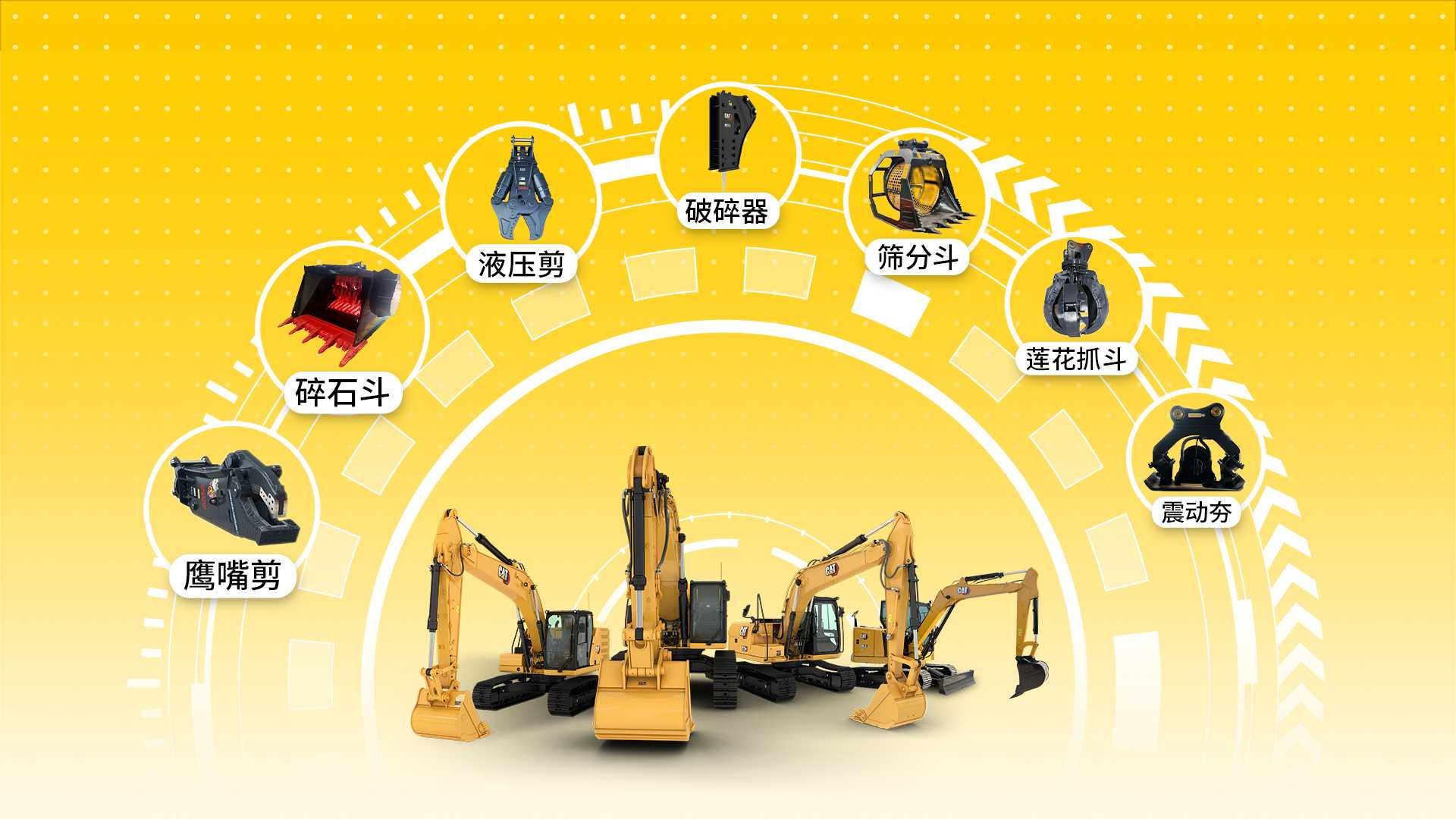 滿足多樣化施工需求,隨心換裝,攻無(wú)不克,驍勇善戰(zhàn)的CAT設(shè)備,配備多種多咱的屬具工裝,逆風(fēng)前行,絕不躺平。