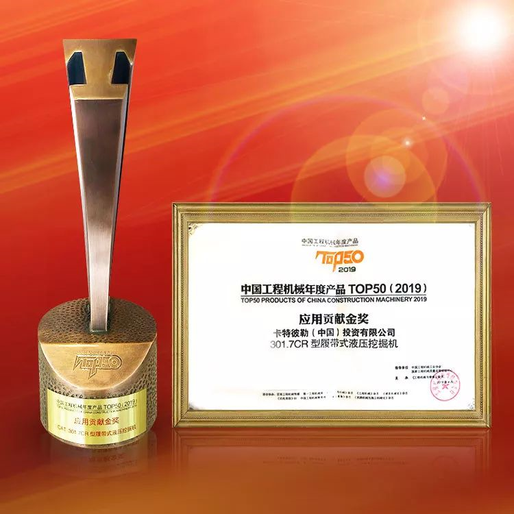 2019年4月2日,由中國工程機械工業協會、國家工程機械質量監督檢驗中心指導的“2019工程機械產品發展(北京)論壇暨中國工程機械年度產品TOP50頒獎典禮”在京隆重舉行。CAT?301.7 CR迷你挖實力登榜榮獲工程機械年度產品“TOP50”應用..